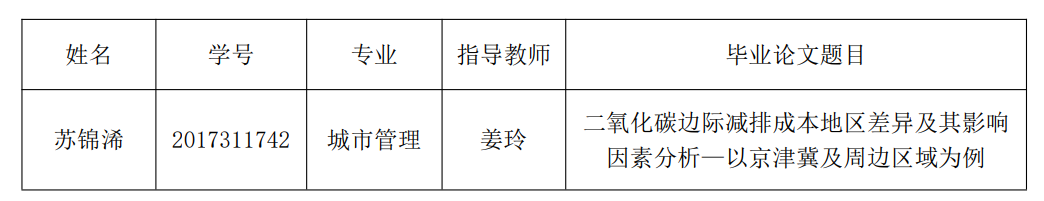 近日,2021年北京市普通高等学校优秀本科生毕业设计(论文)评选结果公布,bat3652017级城市管理专业本科生苏锦浠的毕业论文荣获优秀毕业设计(论文),论文题目为《二氧化碳边际减排成本地区差异及其影响因素分析—以京津冀及周边区域为例》,指导教师为姜玲教授。