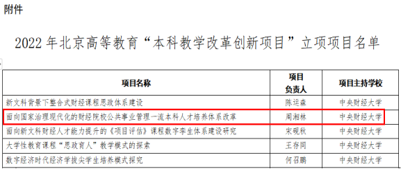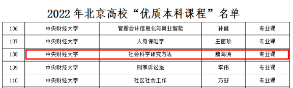 近日,北京市教育委员会先后发布了《北京市教育委员会关于公布2022年北京高等教育本科教学改革创新项目的通知》(京教函〔2022〕395号)和《北京市教育委员会关于公布2022年优质本科课程和优质本科教材课件遴选结果的通知》(京教函〔2022〕394号),其中,bat365周湘林副教授主持的教改课题《面向国家治理现代化的财经院校公共事业管理一流本科人才培养体系改革》获得立项;魏海涛副教授主讲的专业课程《社会科学研究方法》获评北京高校“优质本科课程”,并认定为“北京高等学校优秀专业课主讲教师”。