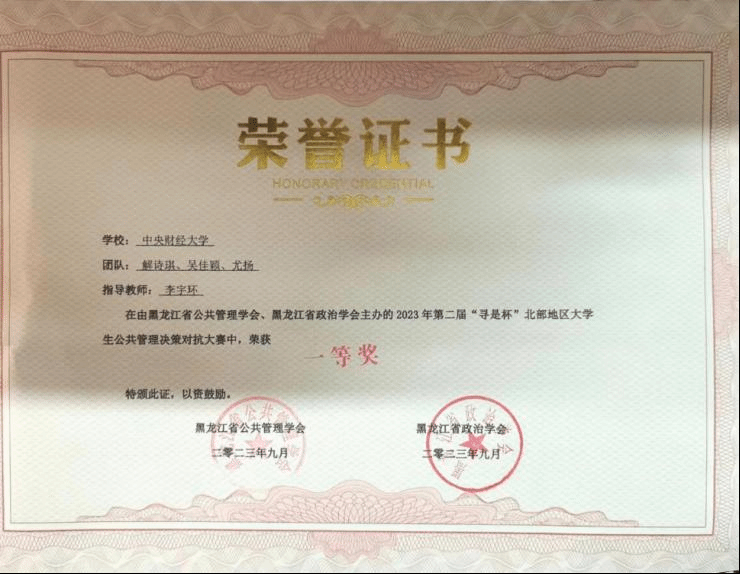 为推进公共管理相关专业实践教学,引导学生关注我国公共管理热点问题,培养具备良好理论素养和分析能力的应用型人才,9月16日至17日,由黑龙江省公共管理学会、黑龙江省政治学会联合举办的第二届“寻是杯”北部地区大学生公共管理决策对抗大赛在黑龙江大学举行。由行政管理系李宇环副教授担任指导教师,行政管理21解诗琪、行政管理21吴佳颖、城市管理21尤扬三位同学组建的“深藏blue”代表队,赴哈尔滨参加现场决策演练沙盘对抗,最终荣获大赛一等奖。