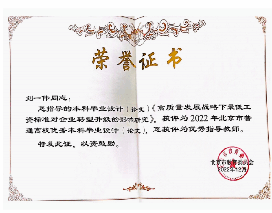 2022年11月3日,北京市教育委员会发布关于公布2022年北京市普通高等学校优秀本科生毕业设计(论文)名单的通知,bat365刘一伟老师指导的本科毕业设计(论文)《高质量发展战略下最低工资标准对企业转型升级的影响研究》获评为2022年北京市普通高校优秀本科毕业设计(论文),刘一伟老师获评为优秀指导教师。