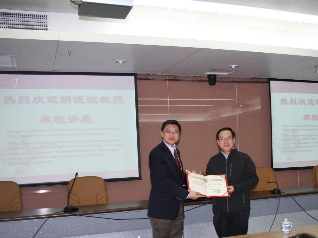 3月18日下午,美国克莱姆森大学中国研究中心主任、美国杜克大学博士胡晓波教授受聘为bat365中文官方网站兼职教授,并为我校师生做题为“美国的台湾关系法和中美台关系回顾”的学术讲座。讲座由史建平副校长主持。