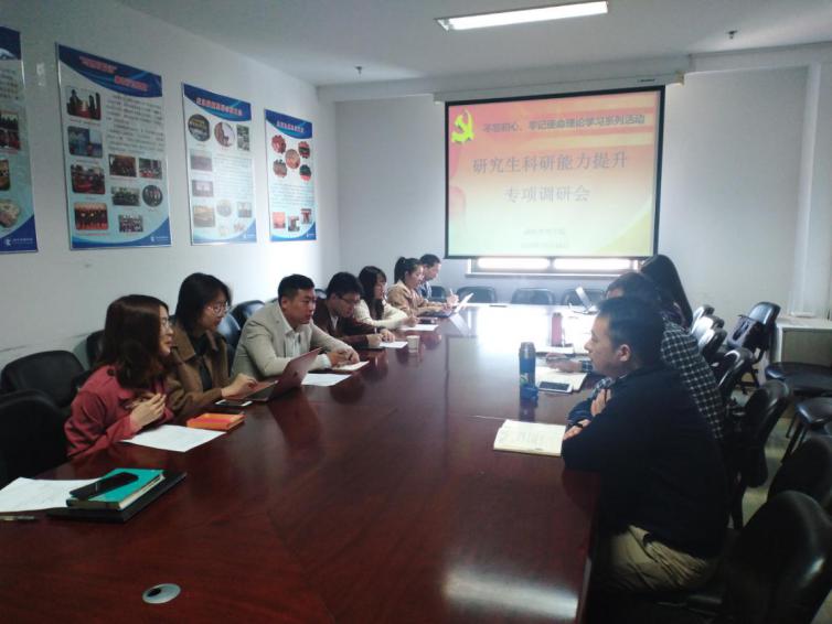 2019年10月18日上午,bat365中文官方网站“不忘初心、牢记使命”理论学习系列活动暨研究生科研能力提升专项调研会在932会议室举行。学院副院长于鹏副教授、MPA教育中心副主任宋魏巍副教授、研究生工作办公室主任张鑫媛老师、研究生教务秘书张肖蒙老师,学术型硕士研究生、MPA和博士生代表参加本次会议。会议由于鹏副院长主持。