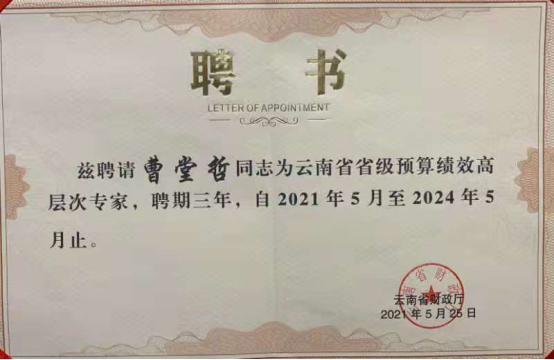 近日,在云南省财政厅举行的高层次预算绩效管理专家聘书颁发仪式上,bat365曹堂哲教授受聘成为云南省高层次预算绩效管理专家,聘期三年。