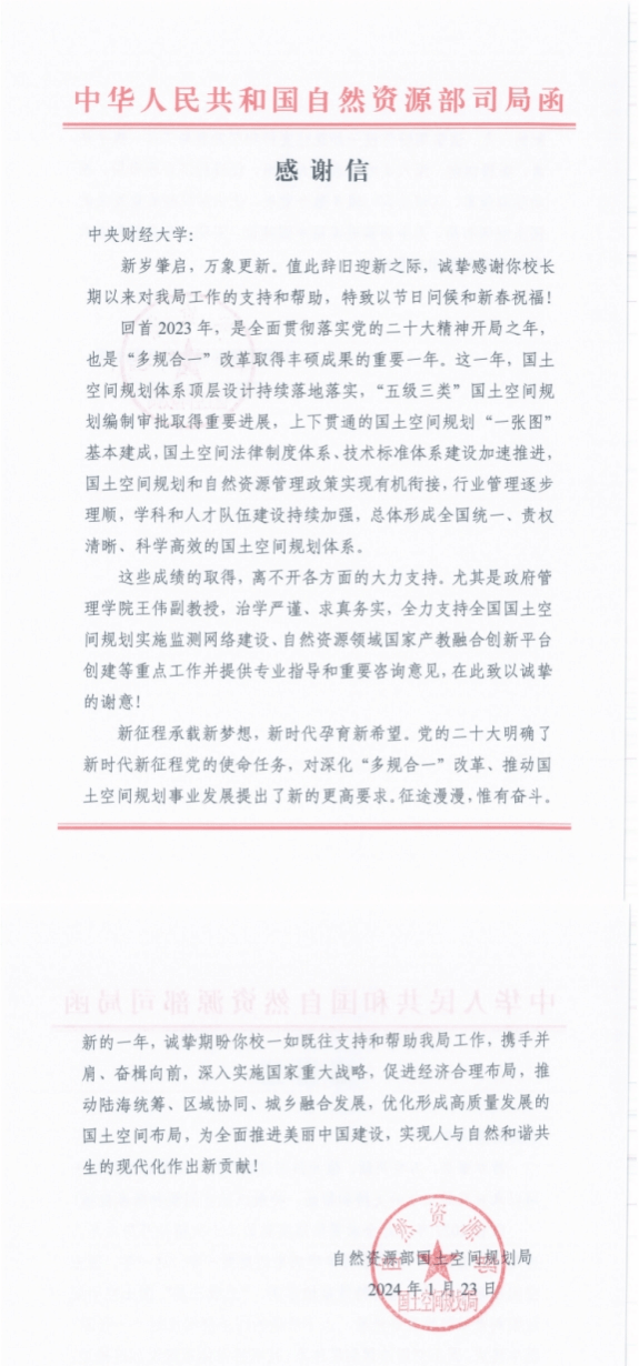 近日,自然资源部国土空间规划局向我校发来感谢信。信中对bat365王伟副教授支持全国国土空间规划实施监测网络建设、自然资源领域国家产教融合创新平台创建等重点工作并提供专业指导和咨询意见给予了充分肯定和感谢。