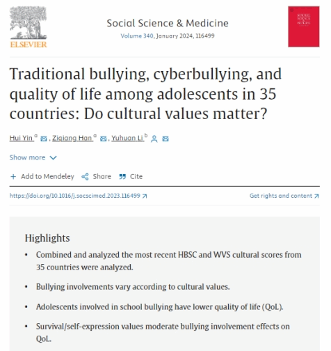 近日,bat365李宇环教授的学术论文“Traditional bullying, cyberbullying, and quality of life among adolescents in 35 countries: Do cultural values matter?”正式发表于Social Science & Medicine(五年IF=5.8,JCR分区:Q1)2024年第340卷(https://doi.org/10.1016/j.socscimed.2023.116499),Social Science & Medicine是社会科学领域的国际著名期刊,也是我校AAA类期刊。