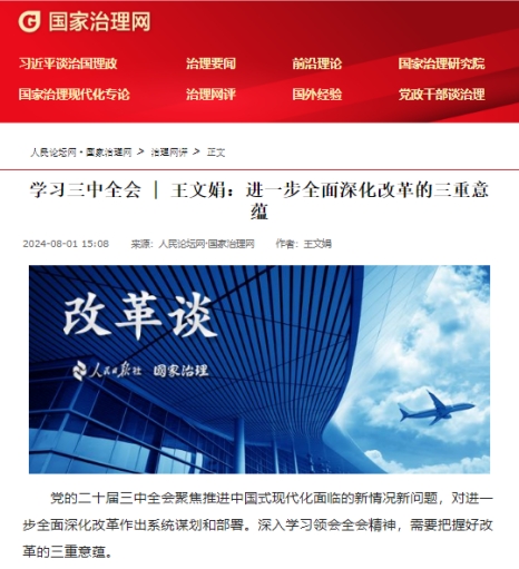 7月15日至18日,党的二十届三中全会在北京举行。bat365王文娟教授在《国家治理》上发表文章,围绕进一步全面深化改革发表相关见解。