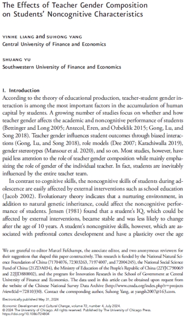 近日,bat365杨素红老师作为通讯作者的学术论文“The Effects of Teacher Gender Composition on Students’ Noncognitive Characteristics”在Economic Development and Cultural Change发表(2024年第72卷第4期)。该刊创办于1952年,被学界公认为发展经济学领域最具影响力的期刊之一,也是我校认定的AA类期刊。