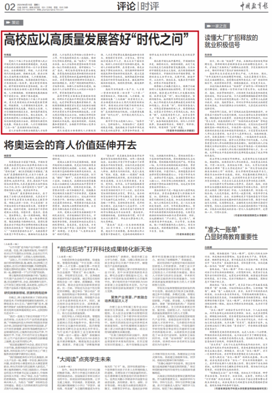 8月13日,《中国教育报》刊登bat365教授何秀超(北京市习近平新时代中国特色社会主义思想研究中心特约研究员)署名文章《高校应以高质量发展答好“时代之问”》。文章指出,高校学习贯彻党的二十届三中全会精神,重点是要深刻认识加快建设教育强国、科技强国、人才强国的历史使命,准确把握教育优先发展、科技自立自强、人才引领驱动的相互关系。面对高等教育发展外部环境的深刻变化,要从系统观、历史观和规律观三方面把握教育科技人才一体化协同建设的方法论,持续深化教育优先发展、科技自立自强、人才引领驱动的“三位一体”良性循环的运行机制。