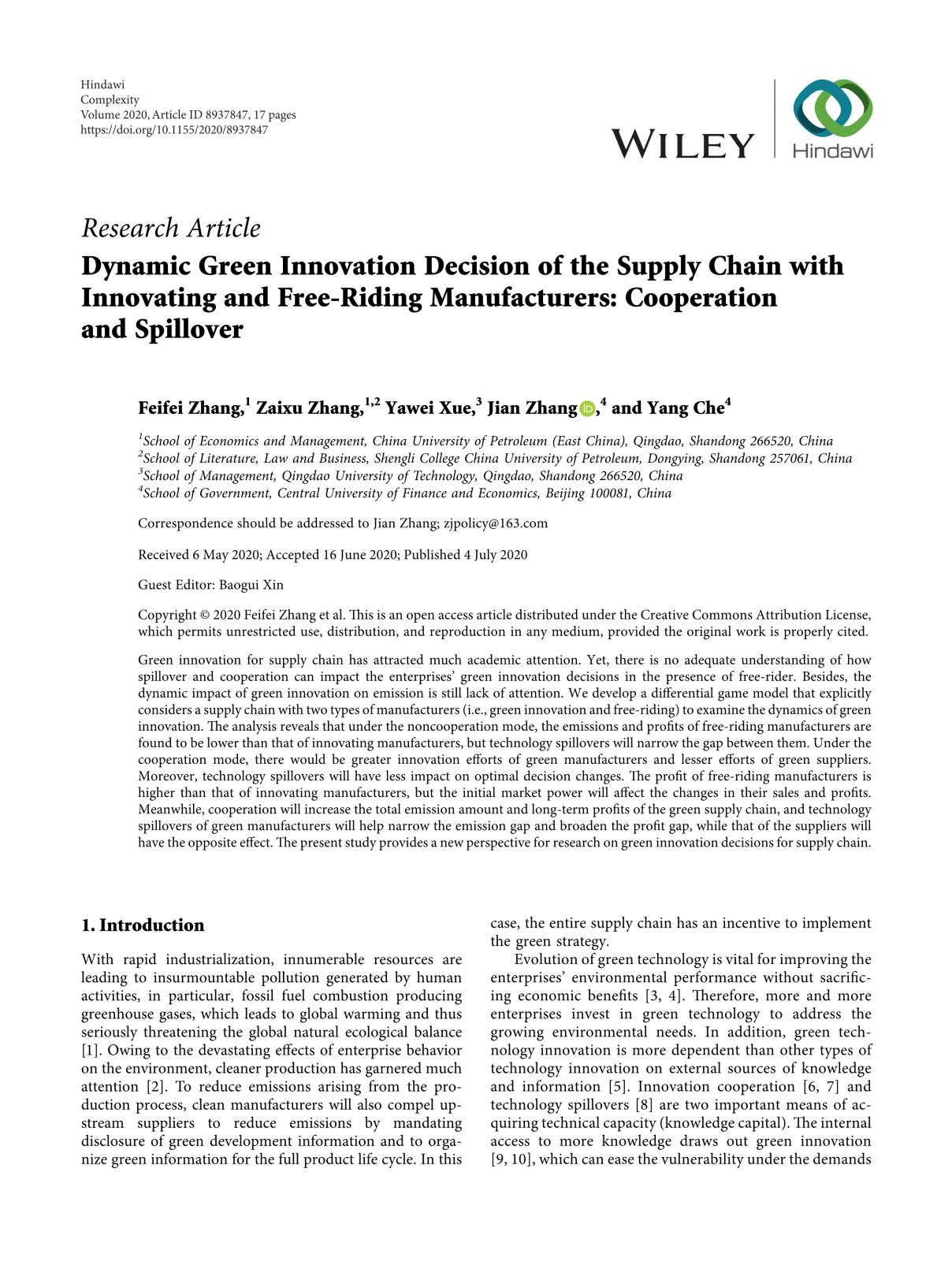 近日,bat365本科生车洋作为共同作者在SCI期刊Complexity(JCR Q1期刊)发表学术论文,题目为“Dynamic Green Innovation Decision of the Supply Chain with Innovating and Free-Riding Manufacturers: Cooperation and Spillover”。该论文分析了在“搭便车”企业存在的情况下,创新溢出效应和合作效应会如何影响企业的绿色创新决策,为绿色技术创新政策设计与企业决策研究提供了新的视角。