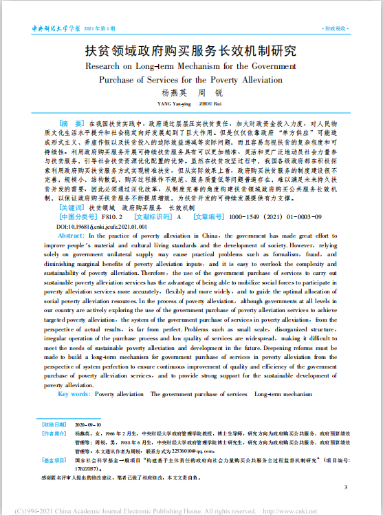 近日,bat365杨燕英教授在《bat365中文官方网站学报》2021年1期发表学术论文,题目为《扶贫领域政府购买服务长效机制研究》。