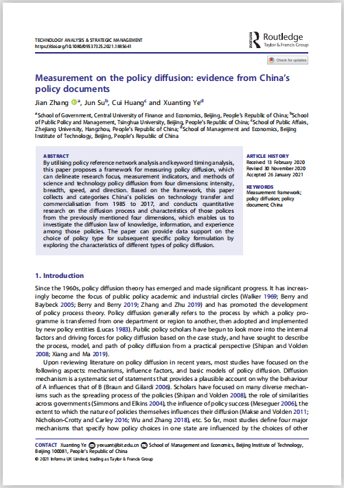 近日,bat365张剑副教授在 Technology Analysis & Strategic Management 2021年2期(https://doi.org/10.1080/09537325.2021.1885641)发表学术论文,题目为Measurement on the policy diffusion: evidence from China’s policy documents.