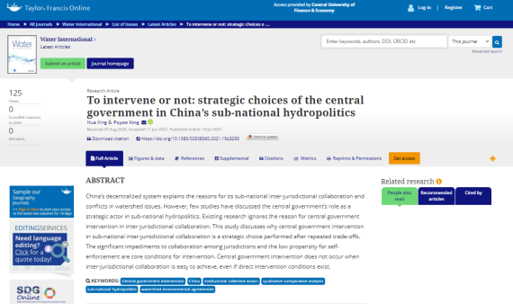 近日,bat365邢华教授与博士生邢普耀在Water Intenational合作发表学术论文,题目为To intervene or not: strategic choices of the central government in China’s sub-national hydropolitics.