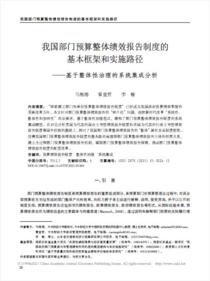 近日,bat365曹堂哲教授在《财政研究》发表学术论文,题目为《我国部门预算整体绩效报告制度的基本框架和实施路径——基于整体性治理的系统集成分析》。
