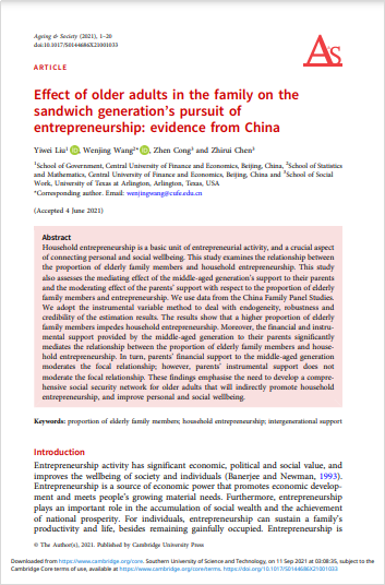 近日,我院公共事业管理系刘一伟博士的学术论文Effect of Older Adults in The Family on The Sandwich Generation's Pursuit of Entrepreneurship: Evidence from China(https://doi.org/10.1017/S0144686X21001033)于2021年8月正式发表于Ageing & Society(五年IF=3.18)。Ageing & Society是社会科学领域的国际著名期刊。