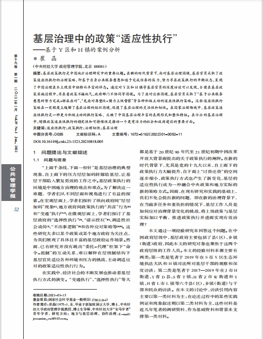 近日,bat365崔晶教授在《公共管理学报》发表学术论文,题目为《基层治理中的政策“适应性执行”—基于Y区和H镇的案例分析》。