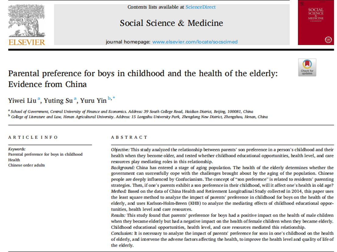 近日,bat365中文官方网站刘一伟博士的学术论文Parental preference for boys in childhood and the health of the elderly: Evidence from China正式发表于Social Science & Medicine(五年IF=5.299,JCR分区:Q1)2022年第302卷(https://doi.org/10.1016/j.socscimed.2022.114986)。Social Science & Medicine是社会科学领域的国际著名期刊,也是我校AAA类期刊。