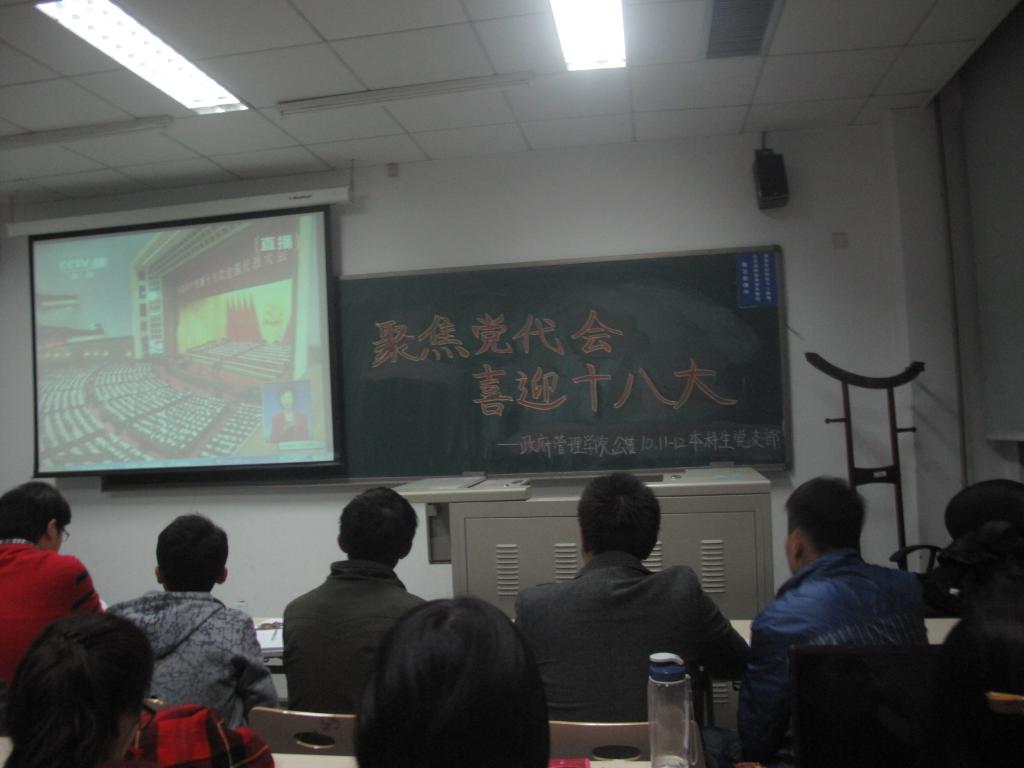 为认真学习党代会精神,2012年11月8日晚上七点,bat365中文官方网站10公管本科生党支部及11、12级本科生党支部在学院3号楼218教室举行了主题为“聚焦党代会喜迎十八大”的党代会观看活动。本次活动由10公管党支部副书记徐世黔同学主持,共有三个年级27名党员、预备党员以及部分入党积极分子参与。通过观看大会,大家更加深入地认识到我党不断发展与时俱进的进取精神和求真务实的工作作风。
