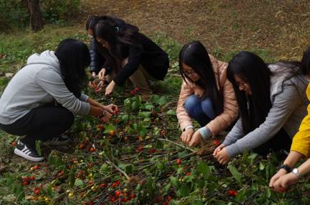 第三组成员则走出校园,以“服务社区”为主题,前往学院志愿基地—爱地敬老院进行了一系列的“爱老敬老”活动。在敬老院中,小组成员积极为菜地除草松土、在菜地里采摘果实并为敬老院清扫落叶。