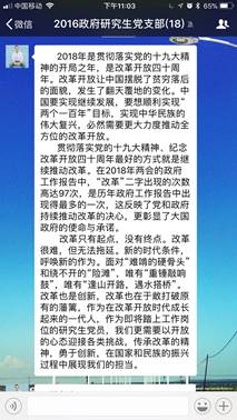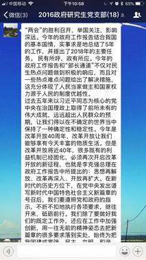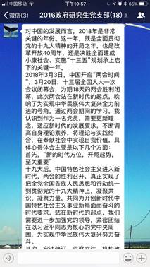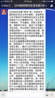 2018年3月底,全国两会正式落下帷幕。对于进入全面小康决胜期的中国而言,以怎样的新举措落实十九大精神,如何开启夺取新时代中国特色社会主义伟大胜利的新征程,如何实现从“赶上时代”到“引领时代”的转变成为了中国当前面临的重大议题。两会顺利召开,让党的主张上升为国家意志,必将凝聚起13亿多中国人民的磅礴力量,向着民族复兴的伟大梦想进军。因而从现实和历史层面上讲,本次两会的召开都具备非凡的意义。党支部成员纷纷就学习两会精神过程中的深切感悟发表看法。现摘录部分党员的学习心得如下: