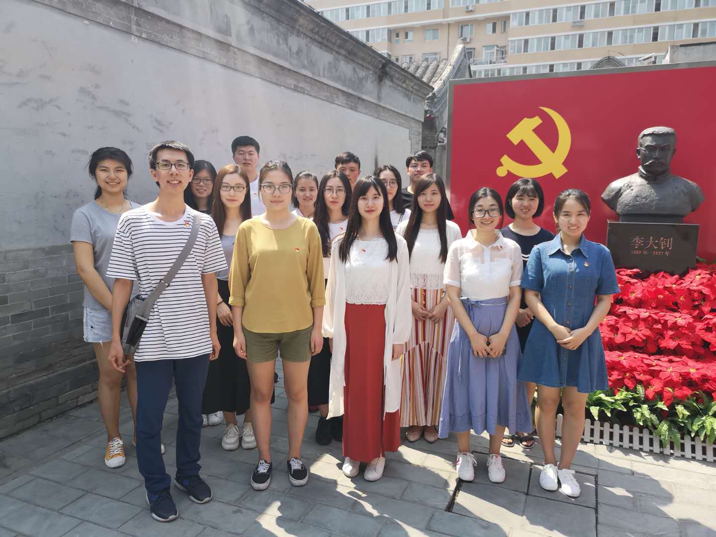李大钊故居位于西城区文华胡同24号,是一座传统的小三合院。1920年春至1924年1月,李大钊先生携家人在此居住将近四年,这座小三合院也因此成为他在故乡之外与家人生活时间最长的一处居所。一进入故居院门,映入眼帘的便是醒目的党旗及李大钊先生铜制半身雕像。大家先后参观了李大钊同志的生平展览、其与家人的生活起居环境等,深入了解了他在中国共产党创立中为中国革命事业所做的突出贡献,深刻体悟到革命英烈伟大的奉献精神、高尚的道德情操和清廉的革命情怀。