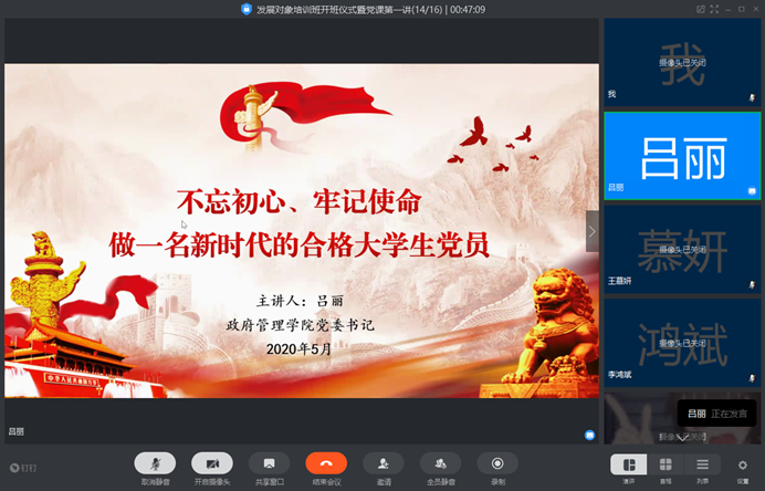 为进一步加强发展对象培训工作,提高发展对象党性修养,切实做好学生党员发展工作,同时为提升学院学生干部的政治素养与理论水平,bat365中文官方网站2019-2020学年第二学期发展对象培训班开班仪式暨党课第一讲于2020年5月30日13点整采用线上会议形式举行。党校校长、学院党委书记吕丽研究员,组织员南琪,党校办公室主任张小林出席,11名发展对象到场参会。本次仪式由党校办公室副主任尹燕斌主持。