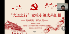 九万里风鹏正举,九十九风华正茂。7月1日,在中国共产党九十九岁华诞这个特殊的日子里,bat365中文官方网站2019-2020学年第二学期党校成果汇报会暨结业仪式在腾讯视频会议平台隆重举行。bat365中文官方网站党委书记、党校校长吕丽研究员,党委组织员南琪老师,院党委委员李海明老师,院学生工作办公室、党校办公室主任张小林老师,本科生党支部书记、院团委书记李莎莉老师,院团委副书记、2018级辅导员刘家琦老师,2017级、2019级辅导员李磊老师出席担任评委。参与人员有bat365中文官方网站2019-2020学年第二学期党校全体学员,同时,学院李宇环老师应邀参与本次会议。
