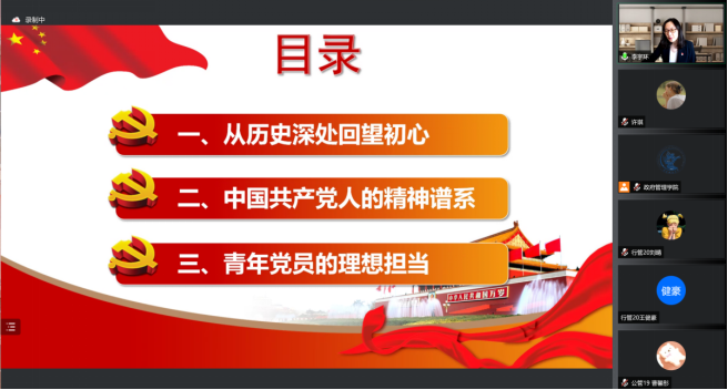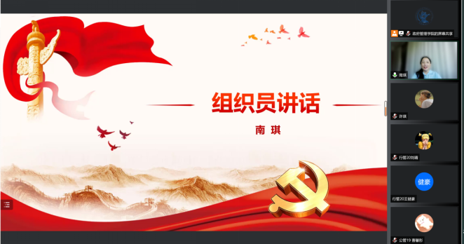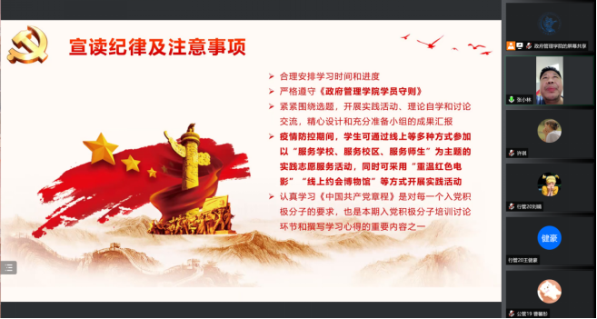2022年5月13日,bat365中文官方网站2022学年第一期入党积极分子培训班开班仪式暨党课第一讲于腾讯会议线上举行,学院党委副书记、党校副校长李宇环副教授,学院党委组织员南琪老师,学院学生工作办公室主任、党校办公室主任张小林老师,以及来自教师、本、硕、博四个群体的45名入党积极分子参加了本次开班仪式。开班仪式由武思豪同志主持。