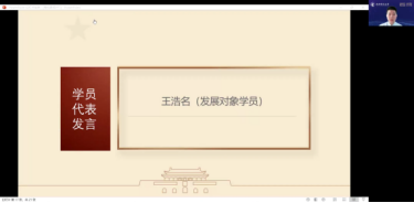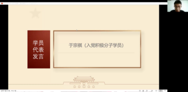以史为鉴,继往开来,不忘初心,奋勇向前。值此二十大将至之际,bat365中文官方网站2022年度第一期党校成果汇报会暨结业仪式于2022年7月12日在腾讯会议平台隆重举行,bat365中文官方网站党委书记、党校校长吕丽研究员,副院长于鹏教授,党委副书记、纪委书记、党校副校长李宇环副教授,组织员南琪老师,学生工作办公室、党校办公室主任张小林老师,研究生工作办公室主任张鑫媛老师,本科生党支部书记、团委书记李莎莉老师,团委副书记、2020级本科生辅导员尹燕斌老师,2019级、2021级本科生辅导员许缤月老师,以及2022年度第一期党校全体学员参加了本期党校成果汇报会暨结业仪式。本次党校成果汇报会暨结业仪式由郭俊铭主持。