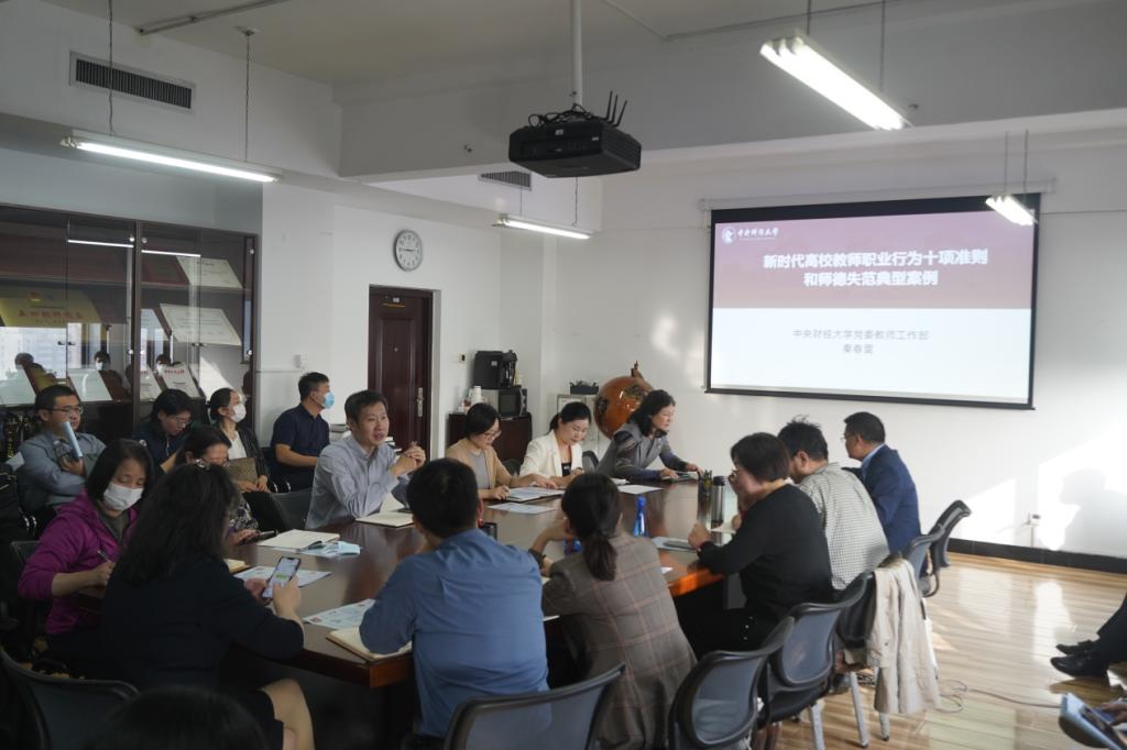 学高为师,身正为范。为深入学习贯彻习近平新时代中国特色社会主义思想和党的二十大精神,进一步加强师德师风建设,引导广大教师不断提高自身道德修养,营造风清气正的育人环境,11月1日下午,bat365中文官方网站邀请学校党委教师工作部秦春雷副部长在学院南路校区1407会议室为全体教师作新时代高校教师职业行为十项准则(以下简称“十项准则”)和师德失范典型案例警示教育专题学习会。会议由学院党委书记于鹏主持。