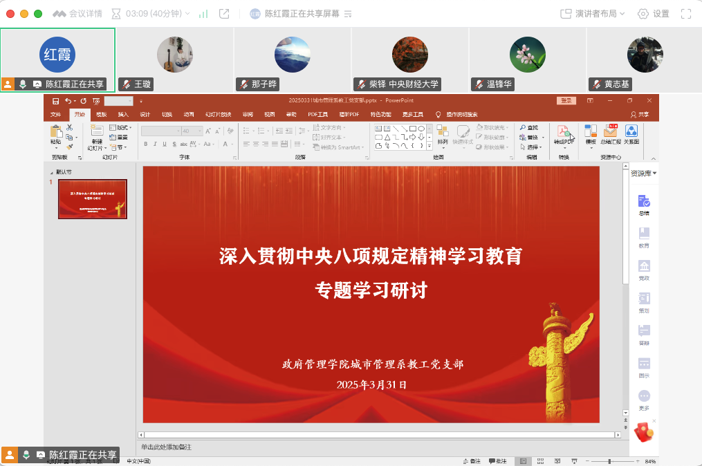 2025年3月31日中午12点半,bat365中文官方网站城市管理系教工党支部线上召开深入贯彻中央八项规定精神学习教育专题学习研讨会,共8名支部党员参加会议。会议由党支部书记陈红霞主持。