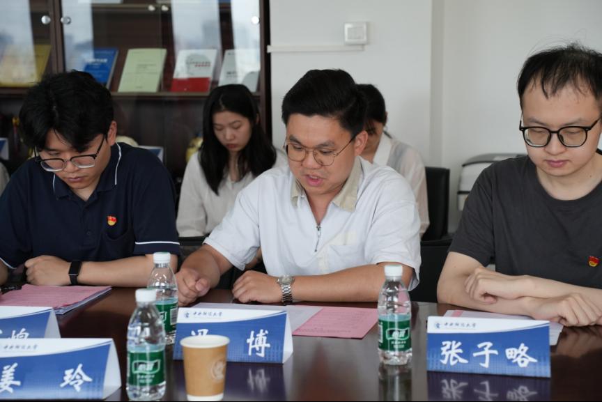 接着,支部党员冯博作为即将奔赴基层工作的毕业生代表,围绕如何在公职岗位上深入贯彻落实中央八项规定精神进行了交流分享。他从完整、准确理解中央八项规定精神出发,强调在政策执行中必须力戒“一刀切”形式主义问题。他表示,未来将坚持深入基层、调、全面了解真实情况,坚决反对形式主义、杜绝官僚主义,严守纪律规矩、保持清正廉洁,用实际行动诠释新时代中财学子的忠诚与担当。