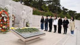 大家沿着红色路线来到无名英雄纪念广场,参观广场浮雕,认真阅读“忠魂”“追梦”“信义”“家国”等主题铭文。“我们把祖国唤为母亲……为了亲人不再蒙受苦难,选择远行,选择战斗”“我们能为伟大的祖国、伟大的党在台湾流第一滴血,我们将光荣地死去!”等内容激荡起满腔爱国豪情。怀着崇敬的心情,行政人员教工党支部在英雄雕像前朗诵《我和我的祖国》,一字一句皆表达了对祖国的热爱,对党的忠诚,对实现中华民族伟大复兴的自信和责任!朗诵结束后,大家对着雕像三鞠躬,感怀忠烈们为祖国统一所做出的巨大牺牲,英雄无名,精神永恒!