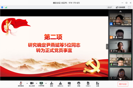 本次党支部大会是bat365中文官方网站本科生党支部在疫情限制下开展工作的一次重要创新,本次大会顺利地完成了毕业生预备党员的转正事宜,为党支部工作积累下宝贵的经验,同时也起到在疫情中鼓舞党员坚持奋斗信心的作用。