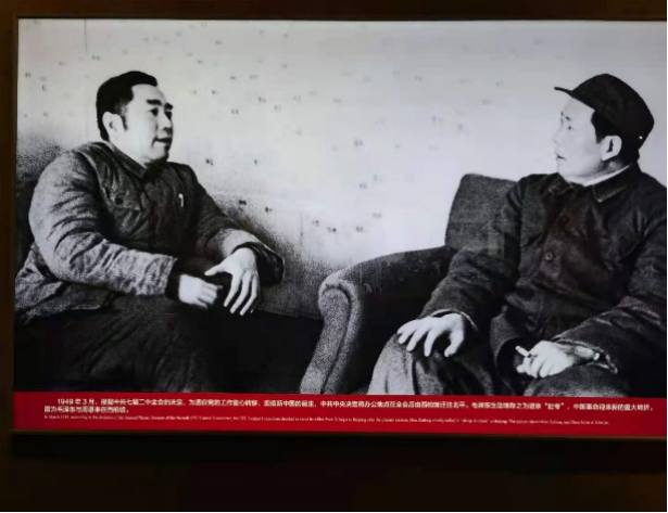 走进展厅,主场馆门口的毛主席雕像与开国大典的浮雕仿佛将我们带回到70多年前,看到了刚刚成立的新中国的样子。展览由“进京‘赶考’”、“进驻香山”、“继续指挥解放全中国”、“新中国筹建”和“不忘初心、牢记使命、永远奋斗”五部分组成。70多年前,党中央从西柏坡动身前往北京时,毛泽东同志向全党发出进京“赶考”的号召:“我们进京‘赶考’去,我们绝不当李自成,我们都希望考个好成绩”。天若有情天易老,人间正道是沧桑!我们回望历史,百年风雨兼程,伟大的中国人民在中国共产党的领导下自力更生、艰苦奋斗,创造了举世瞩目的中国奇迹,没有共产党就没有新中国!