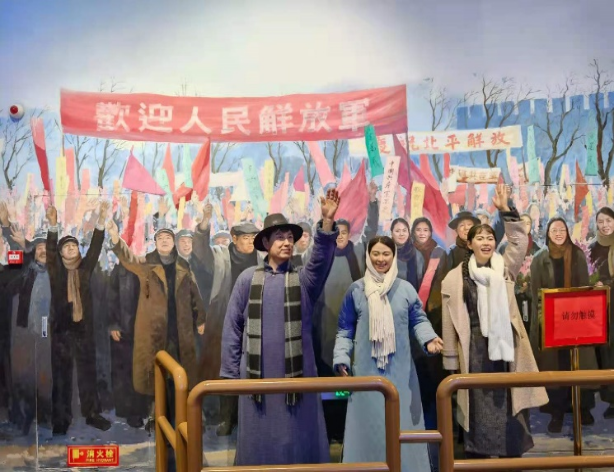 展览馆通过800多张图片、报照、地图、表格和1200多件实物、文献以及档案,全景式生动呈现了中共中央在香山期间领导全国各族人民,完成民族独立和人民解放的历史使命、开启中国历史发展新纪元的光辉历程。一件件饱经沧桑的珍贵文物、一张张定格历史的资料照片、一幕幕展现风云变迁的珍贵影像……看到这些,那段波澜壮阔的革命历程似乎又在大家眼前重现。第一个景观场景让我们记忆深刻:走进一条狭长的甬道,两侧是迎接解放军进城的“人们”。有些举着横幅,有些挥舞双手,每个人脸上都洋溢着发自内心的笑容。那时的北平人民是多么的盼望解放军的到来,中国人民终于要迎来了胜利的春天。