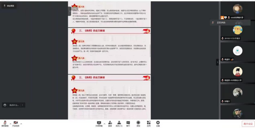 会议伊始,由主持人放映学习解读《中国共产党普通高等学校基层组织工作条例》文字内容,全体同志共同回顾、学习。条例以习近平新时代中国特色社会主义思想为指导,对高校基层党组织做出了进一步的规范。从内容上,条例共分为十章三十九条,在机构设置、职责规范、各项工作建设与领导保障等方面进行阐述与深入解读,新时代高校党组织应保持真抓实干的工作作风,做到知行合一,从理论上把握精神指引与基本工作规范流程,在实践上进行理论落实,为进一步建设好新时代高校党组织提供了基本范式。