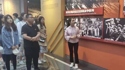 四位讲解员:曹静、谭纪婷、牛炳锟和李宁同学先后对中国局部抗战、全民族抗战、中流砥柱、日军暴行、东方主战场、国际社会支援、伟大胜利等部分的展览内容进行了讲解。在他们生动的讲述下,老师和同学们从九一八事变回顾到抗日民族统一战线的正式形成,从《论持久战》的发表走到日本宣布无条件投降,十四年的英勇斗争和浴血抗战的中华民族解放历程清晰而深入地再一次展现在面前,大家认真倾听,默默凝视,感动于英雄们的满腔热血和爱国之情。七七事变文物组群、平型关大捷纪念雕塑、英雄母亲邓玉芬像、世界反法西斯战争纪念墙……文物史实资料让大家仿佛置身于历史洪流之中,见证着一个个咆哮冲锋的中华儿女、一场场不畏牺牲的战役史诗。参观结束,同学们热血沸腾,心潮难平,满怀对英雄的深切缅怀与无上敬意。历史是最好的教科书,让我们铭记历史,缅怀先烈,珍爱和平,开创未来。