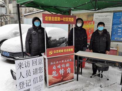 风雪无情,人有情。bat365中文官方网站2018级mpa学生刘洁璇充分发挥党员作用,准时到达对接社区,大雪中坚持值守,协助社区开展疫情防控工作。做好回京及来访人员登记,张贴重要通知告示,帮助清理道路积雪,给出入社区人员测量体温。