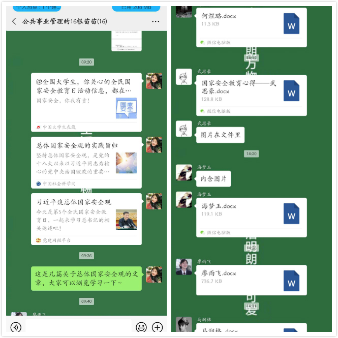 学院统筹党支部、团学组织、班级等工作力量,充分调动师生的积极性、主动性和创造性,把统一组织活动与自主开展活动结合起来,增强宣传教育的吸引力和感染力。师生党支部通过学习强国APP、微信群、线上会议等媒介组织线上“微学习”;学院团委依托学院微信公众号策划推出《国家安全教育日来临,安全达人“速成秘籍”在此!》专题知识问答推送,拟策划向全院团支部开展以“守护国家安全人人有责”为主题的团日活动,旨在向学院师生科普总体国家安全观,教育引导全院师生学习贯彻总体国家安全观,扛起维护国家安全的重任;学院学生会开展了“我与总体国家安全观”线上研讨活动,学生干部们互相交流学习心得,各抒己见,讨论热烈;在班主任、辅导员的指导下,部分班级组织开展了主题“云”班会活动,观看国家安全教育课相关视频,普及国家安全知识及其重要性,集中学习、集中讨论、撰写心得、分享体会,充分调动学生的积极性研讨应如何维护国家安全,增强同学们的国家安全意识。