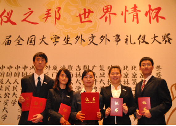 由外交部和外交学院组织,旨在普及大学生外交外事礼仪知识、提高大学生国际化水平,进而促进中国国际交往的“第九届全国大学生外事外交礼仪大赛”,于2010年10月30日在钓鱼台大酒店落下帷幕。由我校选派的09国政陈瑶瑜、李松霖,09心理特日格乐,09保险刘明浩组成的代表队经过两轮紧张角逐,最终从包括北京大学、清华大学、中国人民大学、复旦大学、浙江大学等在内的全国22支高校参赛队中脱颖而出,凭借其突出表现获得比赛第二名,冠军由外交学院夺得。