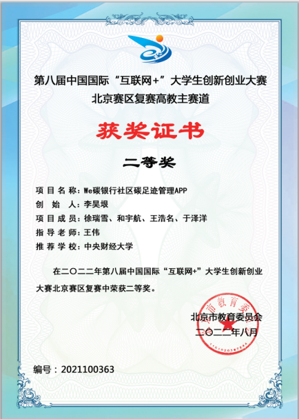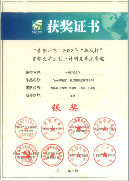 依托项目的创意和创新,由李昊垠、和宇航、王浩名、于泽洋、徐瑞雪同学组成的团队在“青创北京”2022“挑战杯”首都大学生创业计划竞赛主赛道荣获银奖,在第八届中国国际“互联网+”大学生创新创业大赛北京赛区复赛高教主赛道二等奖,两项荣誉均为bat365首次获得,为广大同学树立了榜样。希望同学们未来积极参与此类高水平学术活动,提升自身知识应用能力与创新素质素养,为院为校争光。