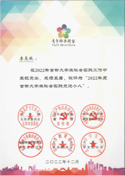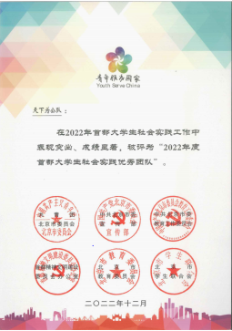 日前,在2022年“青年服务国家”首都大学生社会实践表彰名单中,天下为公队荣获北京团市委等评选的2022年“青年服务国家” 首都大学生社会实践优秀团队,团队负责人李昊垠同学被评为2022年“青年服务国家” 首都大学生社会实践先进个人。