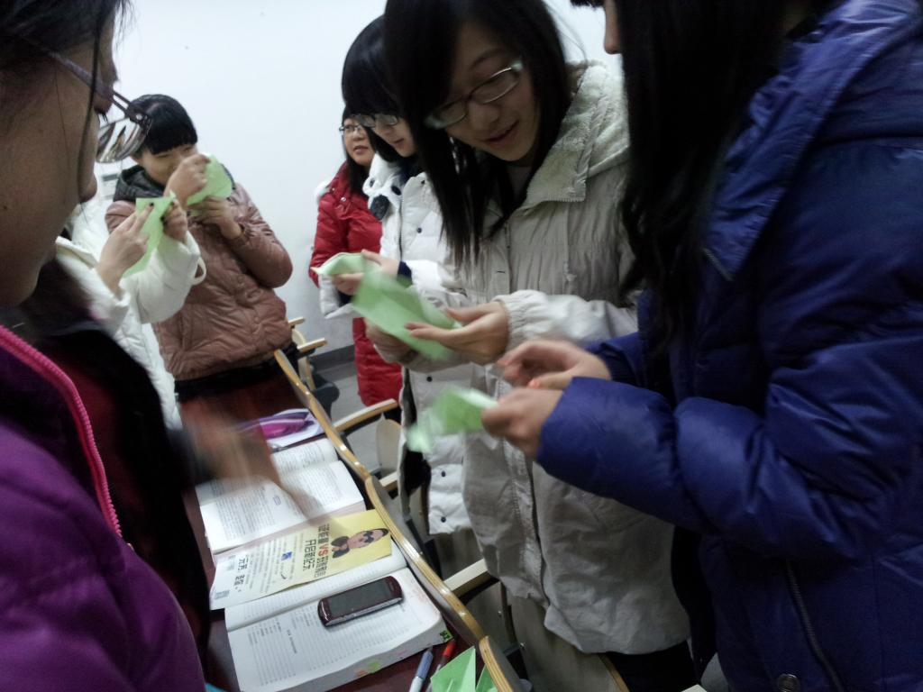 12月19日—21日,我们陆续回收大家的心愿并将其叠成纸船的形状,象征美好的寄托。21日下午利用世界经济史课间休息的时间,“游戏”便开始了:大家纷纷凑到桌旁进行抽签,将纸船打开的一刹那,不仅看到了他人的心愿,更是有一句“Merry Christmas&Happy New Year”的彩色祝福。打电话的声音此起彼伏,心愿陆续找到主人。“期末不挂科”、“要一份早餐”、“请吃水果”、“帮讲微积分”等等的心愿在让大家发笑的同时,也体味到活动的趣味。