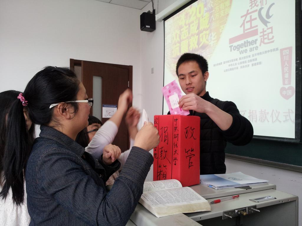4月24日上午10点,沙河校区主教302由bat365中文官方网站国际政治12班举行了短暂的为四川地震灾区募捐活动。4月20日,四川省雅安市发生7.0级地震,之后大小余震接二连三,灾区的实时消息无不牵动着每位国人的心。因此,bat365中文官方网站国际政治12班同学联合发起号召向灾区募捐,用微薄之力表达爱心。