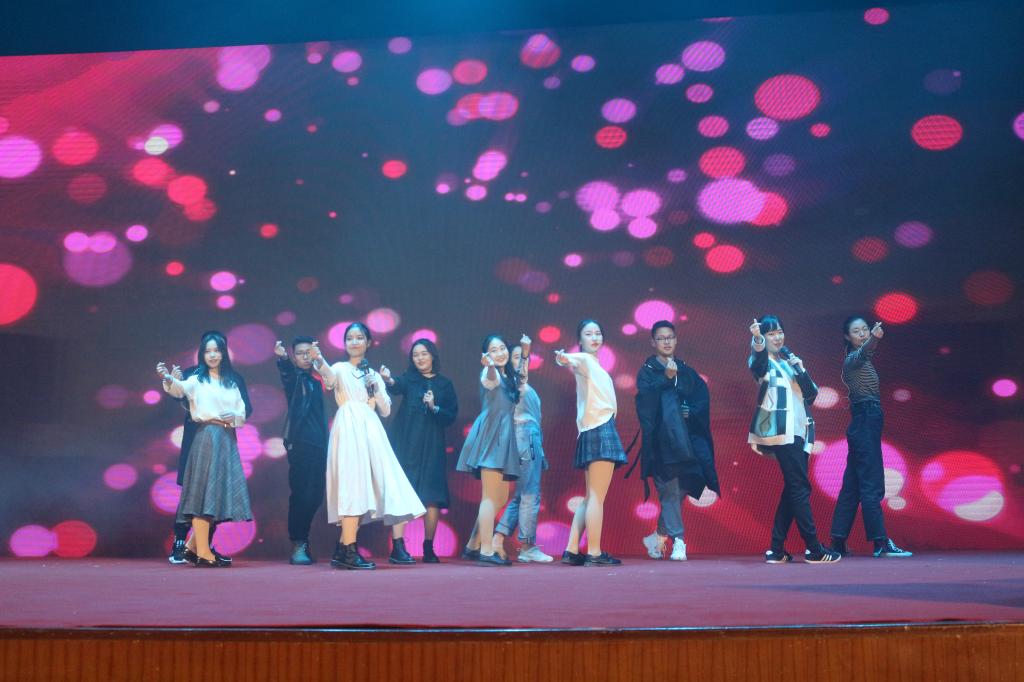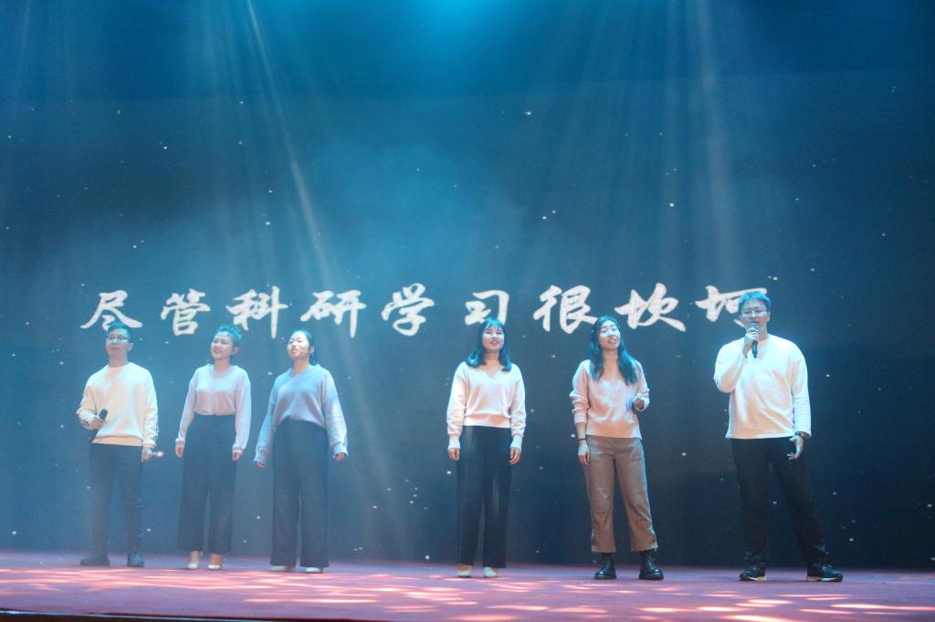 第二个节目是19级学术研究生带来的集体节目《学研政青春》。舞台的帷幕缓缓拉开,19级学术研究生带着自信洋溢的笑容,心怀希望,挥洒着青年人的活力与热情,展现着对待研究生生活的态度。整齐划一的舞蹈动作以及对歌词独具匠心的改写,正是19级学术研究生们对待生活、学术的热情态度和自信心境。听,他们在说:我们面对困难不服输、面对生活不低头!