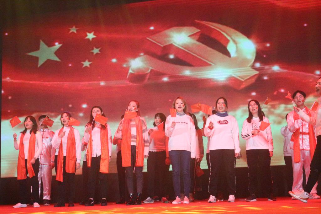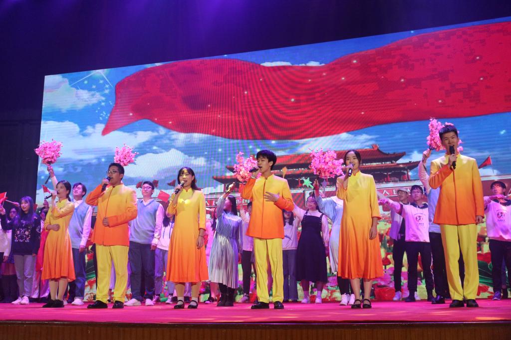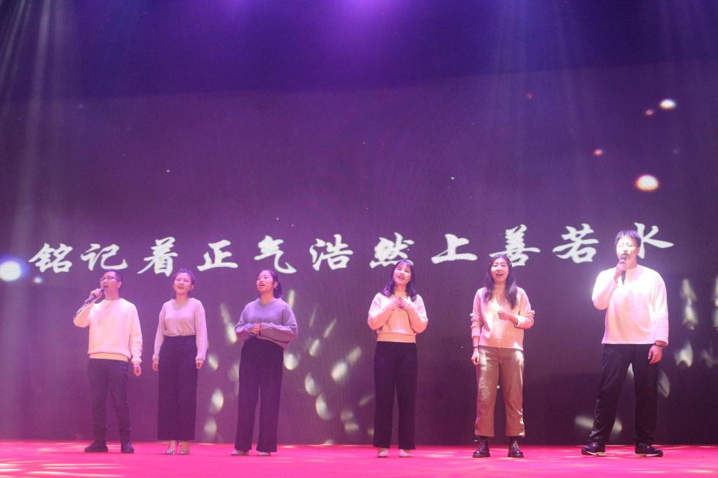联欢会最后一项节目是由国庆广场合唱团成员、“春潮滚滚”方阵成员、演职人员代表共同带来的大合唱《不忘初心》。大合唱《不忘初心》将每个人的爱国情怀调动起来,全场气氛升华到最高。红日初升,其道大光,河出伏流,一泻汪洋,我政管学子定将不忘初心牢记使命,书写我们的青春芳华。