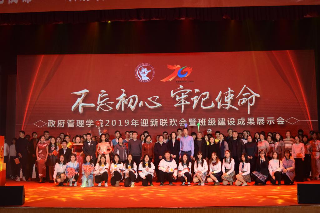2019124日中午130分,以“不忘初心、牢记使命”为主题的bat365中文官方网站2019年迎新联欢会暨班级建设成果展示会在学院南路校区学术会堂206顺利举办。bat365中文官方网站院长姜玲教授,党委书记吕丽研究员,副院长于鹏副教授,副院长张剑副教授,党委组织员南琪副教授,院务会成员、城市管理系邢华教授,党委委员、行政管理系副主任崔晶教授,行政管理系教师党支部书记李文彬教授,公共事业管理系副主任张相林副教授,国际政治系副主任江涛副教授,国际政治系副主任辛平老师,刘庆乐副教授,宋魏巍副教授,温锋华副教授,那子晔老师,杨素红老师及各位新生班主任和各系老师出席此次迎新联欢会。联欢会由19级学术研究生葛晓琳、公共管理类19-1班张宏伟、公共管理类19-3班班倩和公共管理类19-1班陈翔骞主持。