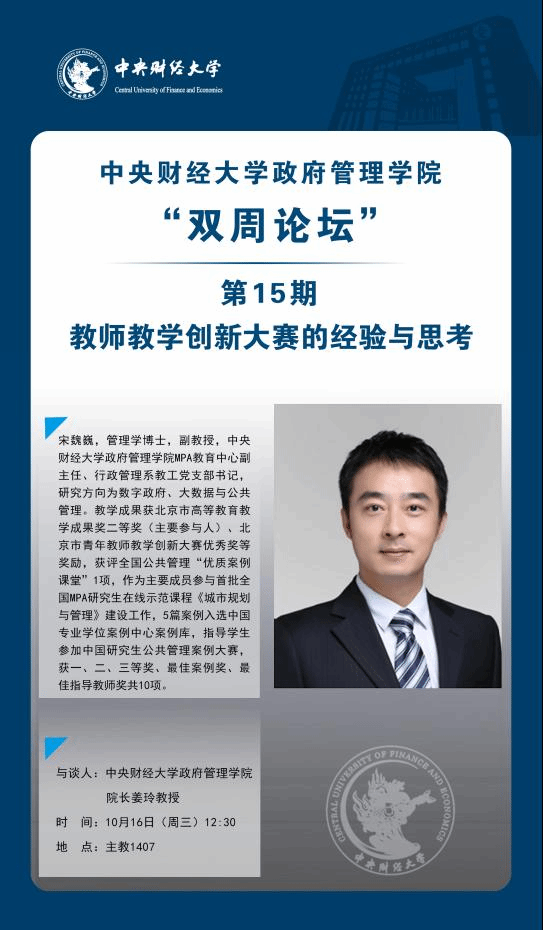 主讲人简介:宋魏巍,管理学博士,副教授,bat365中文官方网站MPA教育中心副主任、行政管理系教工党支部书记,研究方向为数字政府、大数据与公共管理。教学成果获北京市高等教育教学成果奖二等奖(主要参与人)、北京市青年教师教学创新大赛优秀奖等奖励,获评全国公共管理“优质案例课堂”1项,作为主要成员参与首批全国MPA研究生在线示范课程《城市规划与管理》建设工作,5篇案例入选中国专业学位案例中心案例库,指导学生参加中国研究生公共管理案例大赛,获一、二、三等奖、最佳案例奖、最佳指导教师奖共10项。