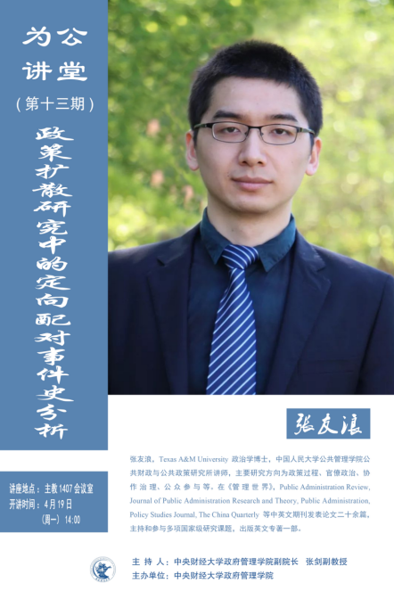 嘉宾简介:张友浪,Texas A&M University政治学博士,中国人民大学公共管理学院公共财政与公共政策研究所讲师,主要研究方向为政策过程、官僚政治、协作治理、公众参与等。在《管理世界》,Public Administration Review, Journal of Public Administration Research and Theory, Public Administration, Policy Studies Journal, The China Quarterly等中英文期刊发表论文二十余篇,主持和参与多项国家级研究课题,出版英文专著一部。