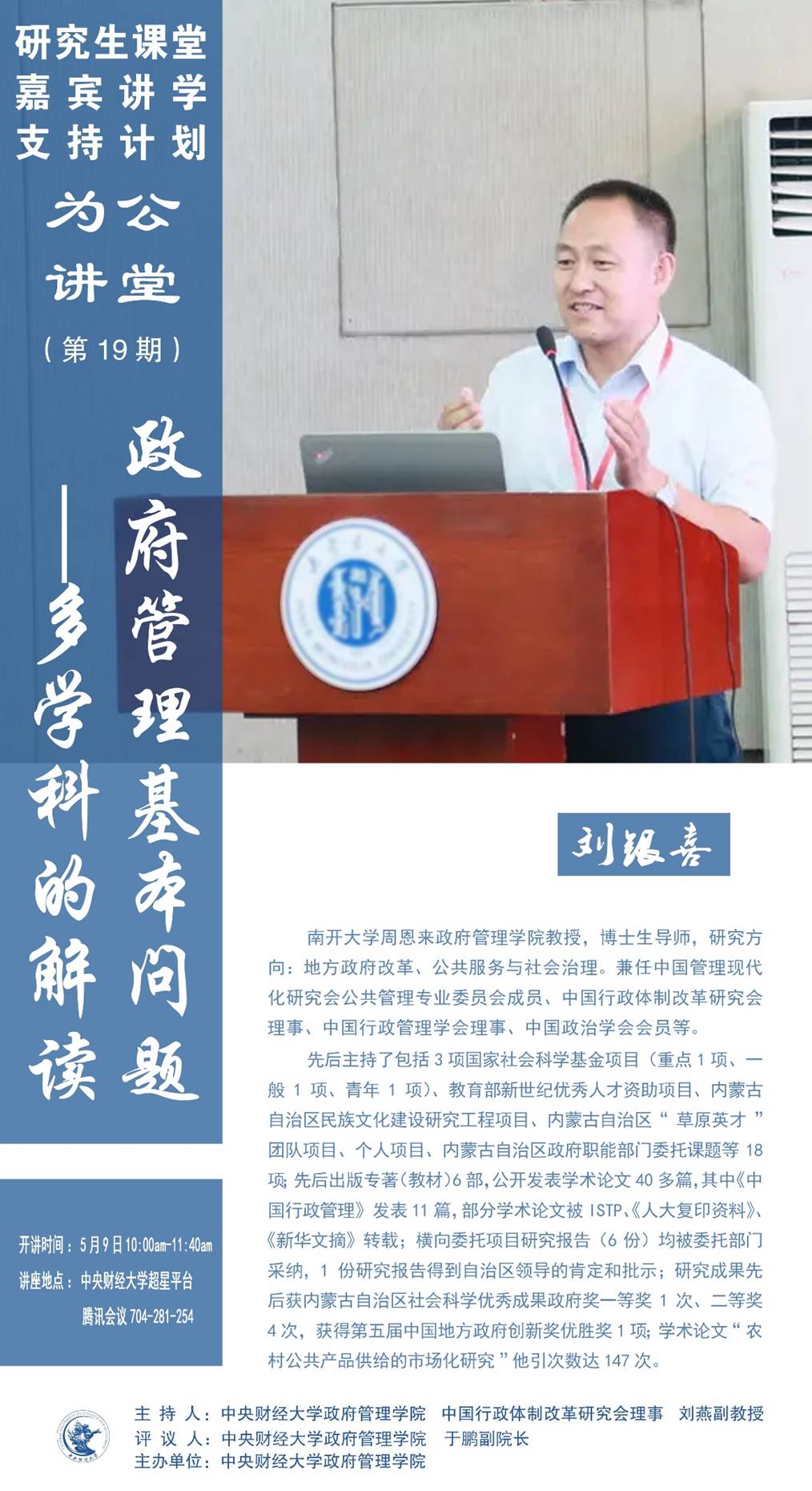 嘉宾简介:刘银喜,南开大学周恩来bat365中文官方网站教授,博士生导师。研究方向:地方政府改革、公共服务与社会治理。兼任中国管理现代化研究会公共管理专业委员会成员、中国行政体制改革研究会理事、中国行政管理学会理事、中国政治学会会员等。先后主持了包括3项国家社会科学基金项目(重点1项、一般1项、青年1项)、教育部新世纪优秀人才资助项目、内蒙古自治区民族文化建设研究工程项目、内蒙古自治区“草原英才”团队项目、个人项目、内蒙古自治区政府职能部门委托课题等18项;先后出版专著(教材)6部,公开发表学术论文40多篇,其中《中国行政管理》发表11篇,部分学术论文被ISTP、《人大复印资料》、《新华文摘》转载;横向委托项目研究报告(6份)均被委托部门采纳,1份研究报告得到自治区领导的肯定和批示;研究成果先后获内蒙古自治区社会科学优秀成果政府奖一等奖1次、二等奖4次,获得第五届中国地方政府创新奖优胜奖1项;学术论文“农村公共产品供给的市场化研究”他引次数达147次。